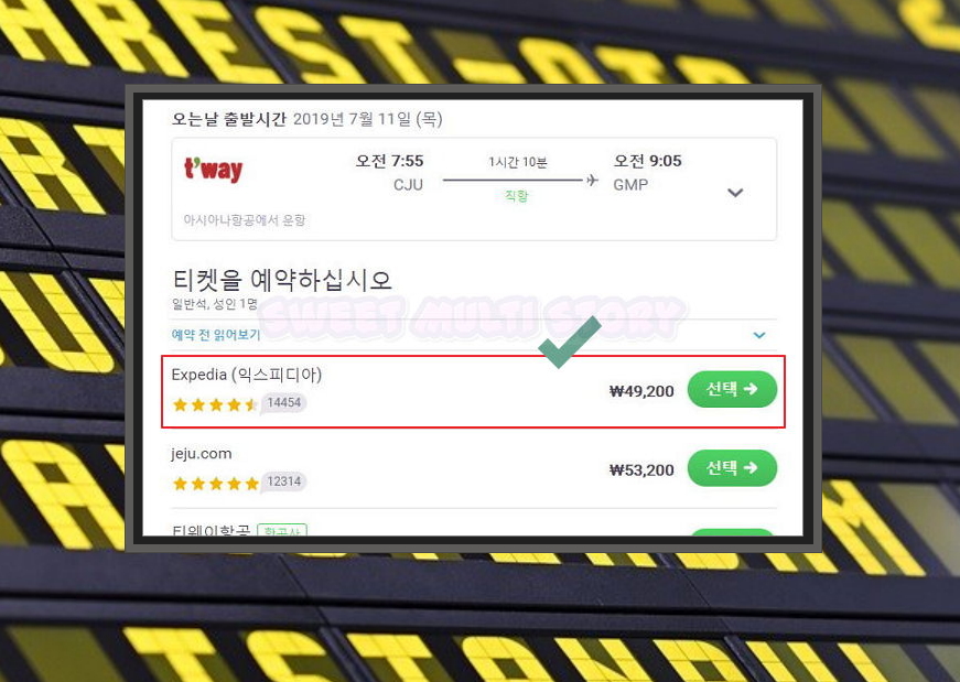 8. 방금 찾은 제주도행 티켓을 예약하고 싶다면 선택 버튼을 누르면 되는데요. 새롭게 열린 페이지에서 여행사를 선택해 주세요. 낮은 금액을 제시한 업체를 선택하시면 돼요.