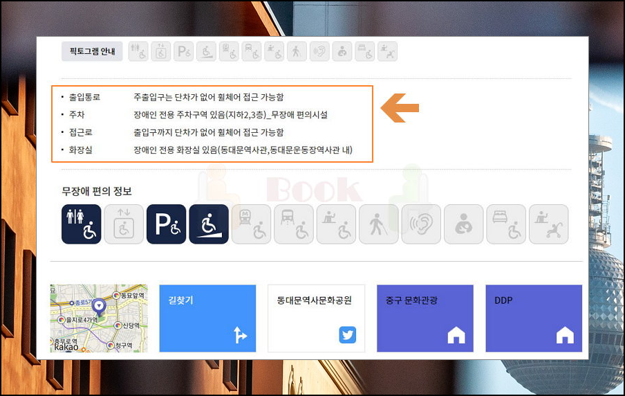 삶의 질이 향상되면서 편의 시설에 대한 중요성이 점점 커지고 있는데요. 화장실, 주차, 접근로, 출입통로에 대한 정보를 홈페이지에서 미리 확인해보실 수 있어요. 아무리 갈만한곳이라고 해도 불편하다면 찾아가기가 쉽지 않죠. 특히 혼자가 아닌 가족이나 연인과 함께 할 때는 더더욱 그렇죠.