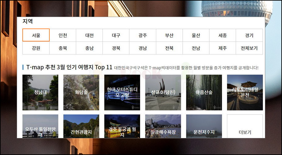 여행지를 누르면 지역별로 나와요. 당일로 가는 경우에는 집에서 가까운 곳이 좋아요. 서울에 사시는 분들은 인천과 경기도에 갈만한곳을 알아보시면 좋고요. 광주나 부산인 경우에는 남해쪽에 갈만한곳을 알아보시면 좋겠죠. 네비게이션으로 T-map을 이용하는 분들의 데이터로 뽑아 보은 인기 여행지 Top 11도 살펴볼 수 있어요.