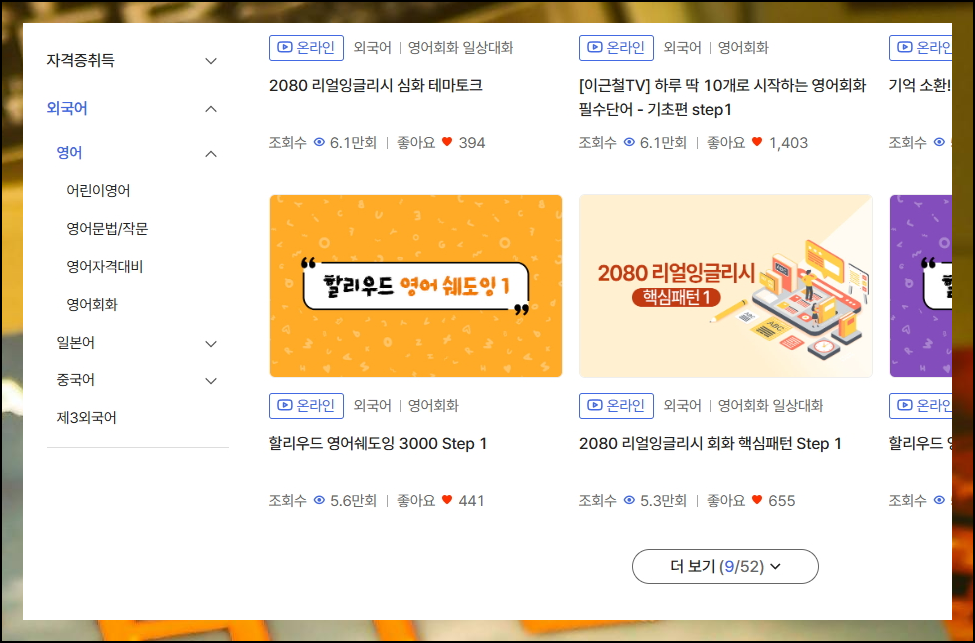 영어회화 관련 강의가 100개가 넘게 준비되어 있어요. 회화뿐만 아니라 문법이나 자격증 공부 혼자하기도 가능합니다. 왼쪽 메뉴에서 영어회화를 클릭하면 회화 강의만 모아볼 수 있어요.