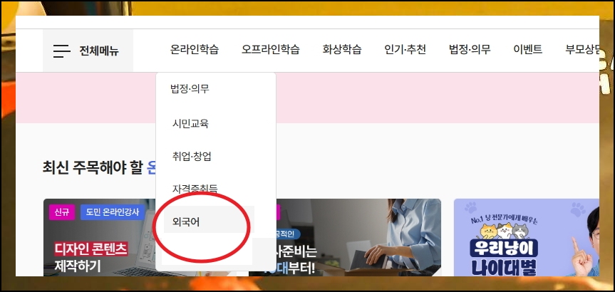 공부 혼자하기를 위한 다양한 배움의 길이 펼쳐져 있어요. 첫 번째로 온라인학습을 클릭하면 됩니다. 여러 분야 중에서 외국어를 선택하면 영어회화를 만날 수 있어요. 좋은방법으로 원하는 강의를 찾을 수 있도록 구성되어 있습니다.
