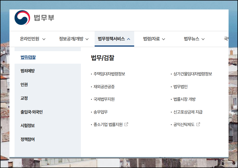민원 처리와 정보 검색이 원스톱으로 해결되는 통합 플랫폼이에요. 무료양식을 받기 위한 첫 단계는 법무정책서비스 메뉴로 이동하는 것입니다. 메인 화면에서 쉽게 찾을 수 있도록 배치되어 있어요.