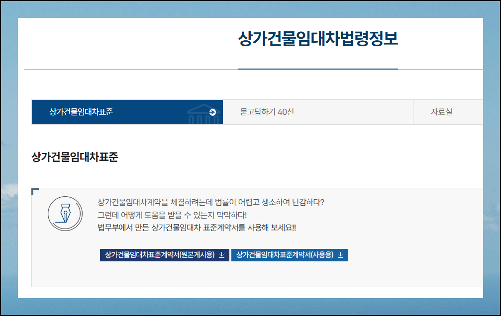 법무정책서비스에서 상가건물 임대차 관련 페이지로 자연스럽게 이동할 수 있어요. 이곳에는 두 종류의 무료양식이 마련되어 있으며, 실제 계약서 체결용으로는 사용용 파일을 선택하시면 됩니다. 현행 법규를 완벽히 반영하도록 제작되었어요.